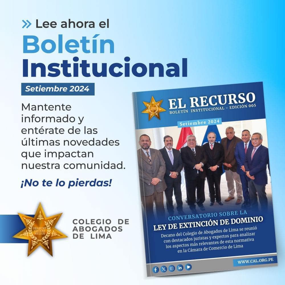 El Colegio de Abogados de Lima presenta la quinta edición de su boletín institucional. En "El Recurso" encontrará información sobre nuestras actividades institucionales, logros, pronunciamientos y demás información de interés para los miembros de la Orden.