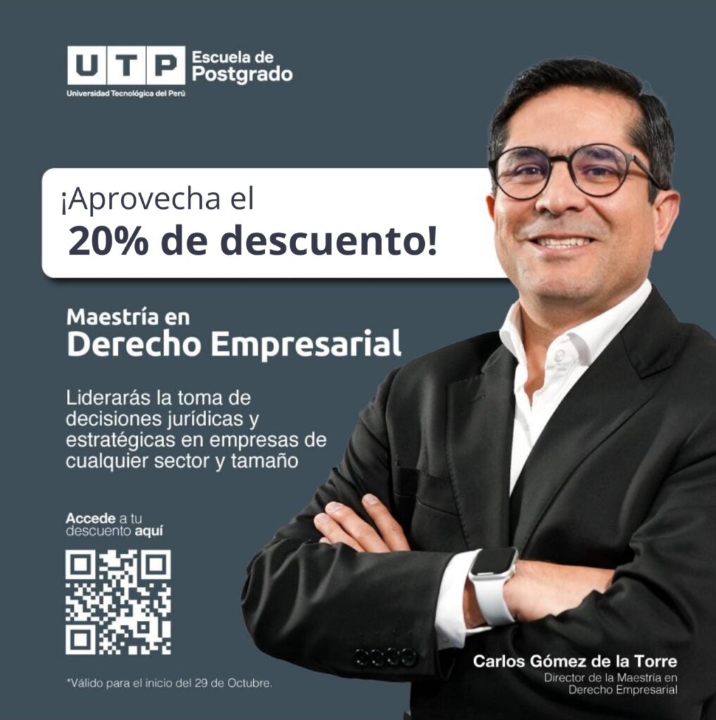 🔵📢 #BeneficiosCAL | ¡Impulsa tu carrera con la Maestría en Derecho Empresarial! | Gracias a las gestiones del CAL con la Universidad Tecnológica del Perú (UTP), nuestros agremiados pueden acceder a un 20% de descuento en la Maestría en Derecho Empresarial, donde adquirirán las competencias necesarias para liderar la toma de decisiones jurídicas y estratégicas en empresas de cualquier sector y tamaño.