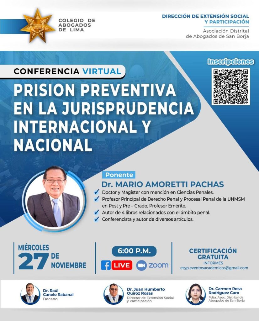 La Dirección de Extensión Social y Participación, a cargo del Dr. Juan Humberto Quiroz Rosas, en coordinación con la Asociación Distrital de Abogados de San Borja, invitan a los agremiados y público general a la CONFERENCIA: "PRISION PREVENTIVA EN LA JURISPRUDENCIA INTERNACIONAL Y NACIONAL”.
