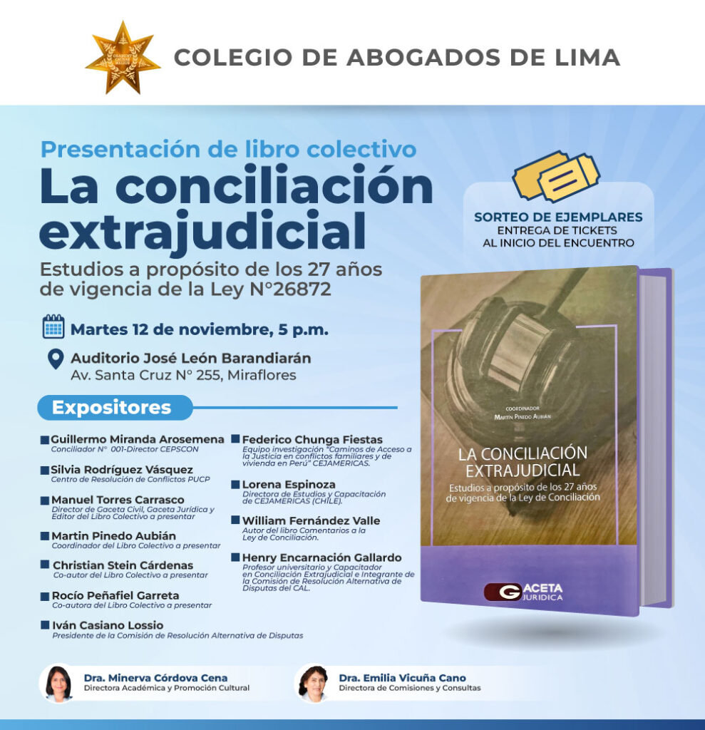 Presentación del libro colectivo "La conciliación extrajudicial" - Estudios a propósito de los 27 años de vigencia de la Ley N° 26872 El Colegio de Abogados de Lima y Gaceta Jurídicate invitan a un evento especial para reflexionar sobre los avances y desafíos de la conciliación extrajudicial en el Perú. 📆 Martes 12 de noviembre 🕔 Hora: 5:00 p.m. 📍 Lugar: Auditorio José León Barandiarán Av. Santa Cruz N° 255, Miraflores (CAL) Expositores: Destacados profesionales compartirán sus perspectivas sobre el impacto y evolución de esta importante ley. Participarán expertos como Guillermo Miranda, Silvia Rodríguez, Manuel Torres, Martín Pinedo, y muchos más. 🎟️ Sorteo de ejemplares: Participa en el sorteo al registrarte al inicio del evento. ¡Te esperamos!