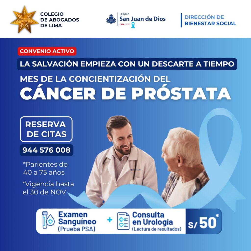 En el Mes de la Concientización del Cáncer de Próstata, el Colegio de Abogados de Lima y la Clínica San Juan de Dios han activado un convenio especial para los agremiados y sus familiares de 40 a 75 años.