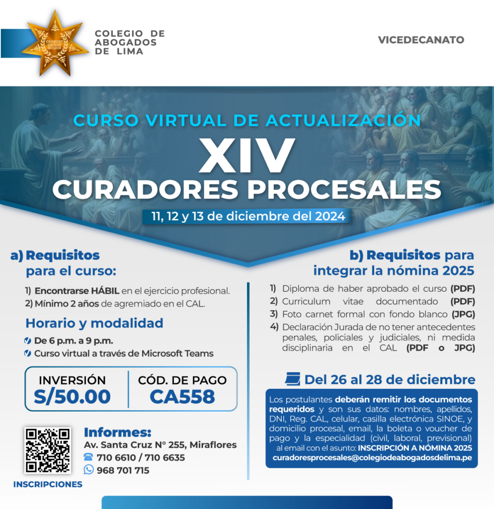 El Colegio de Abogados de Lima invita a todos los agremiados a participar en el XIV Curso de Actualización para integrar la nómina de CURADORES PROCESALES, que se realizará: