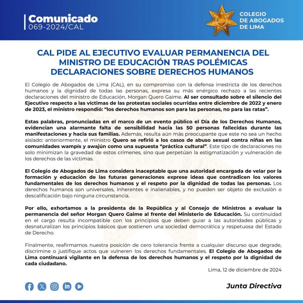 El Colegio de Abogados de Lima (CAL), en su compromiso con la defensa irrestricta de los derechos humanos y la dignidad de todas las personas, expresa su más enérgico rechazo a las recientes declaraciones del ministro de Educación, Morgan Quero Gaime. Al ser consultado sobre el silencio del Ejecutivo respecto a las víctimas de las protestas sociales ocurridas entre diciembre de 2022 y enero de 2023, el ministro respondió: “los derechos humanos son para las personas, no para las ratas”.