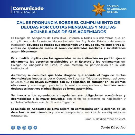El Colegio de Abogados de Lima (CAL) informa a todos sus miembros que, en cumplimiento de lo establecido en los artículos 6 y 9 del Estatuto de nuestra institución, aquellos abogados que mantengan una deuda equivalente a tres (3) cuotas de aportación mensual serán considerados inactivos e inhabilitados automáticamente.