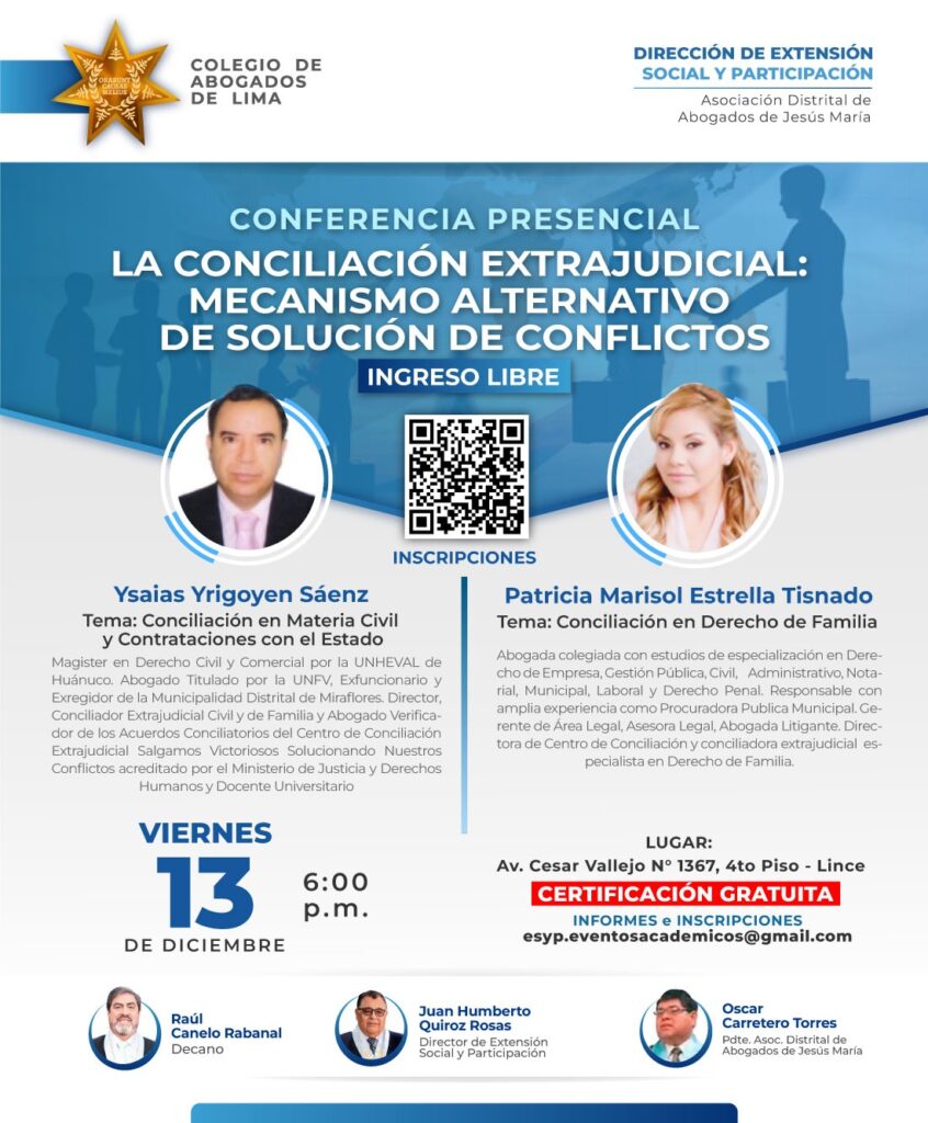 🔵 📢 | INGRESO LIBRE | La Dirección de Extensión Social y Participación, a cargo del Dr. Juan Humberto Quiroz Rosas, en coordinación con la Asociación Distrital de Abogados de Jesús María, invitan a los agremiados y público general a la CONFERENCIA PRESENCIAL: "La Conciliación Extrajudicial: Mecanismo Alternativo de Solución de Conflictos"