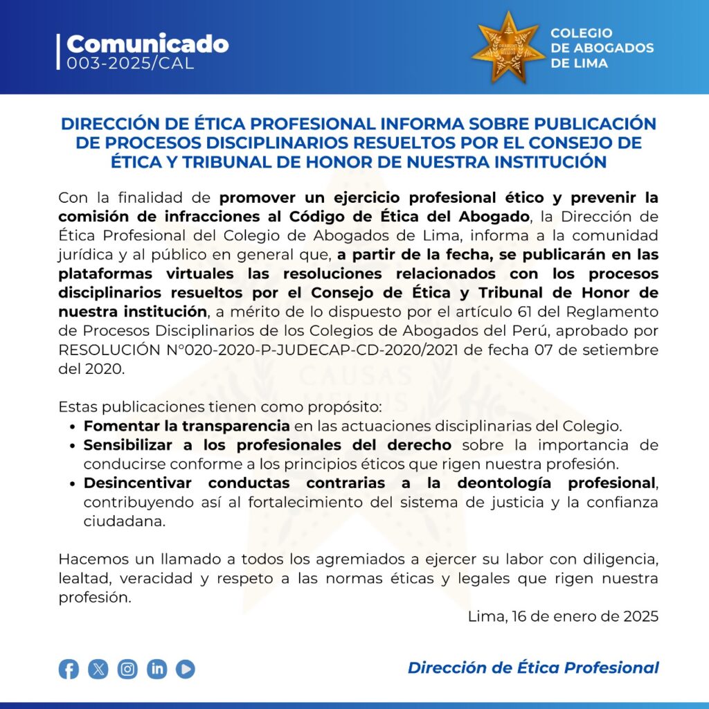 Con la finalidad de promover un ejercicio profesional ético y prevenir la comisión de infracciones al Código de Ética del Abogado, la Dirección de Ética Profesional del Colegio de Abogados de Lima, informa a la comunidad jurídica y al público en general que, a partir de la fecha, se publicarán en las plataformas virtuales las resoluciones relacionados con los procesos disciplinarios resueltos por el Consejo de Ética y Tribunal de Honor de nuestra institución, a mérito de lo dispuesto por el artículo 61 del Reglamento de Procesos Disciplinarios de los Colegios de Abogados del Perú, aprobado por RESOLUCIÓN N°020-2020-P-JUDECAP-CD-2020/2021 de fecha 07 de setiembre del 2020. Estas publicaciones tienen como propósito: