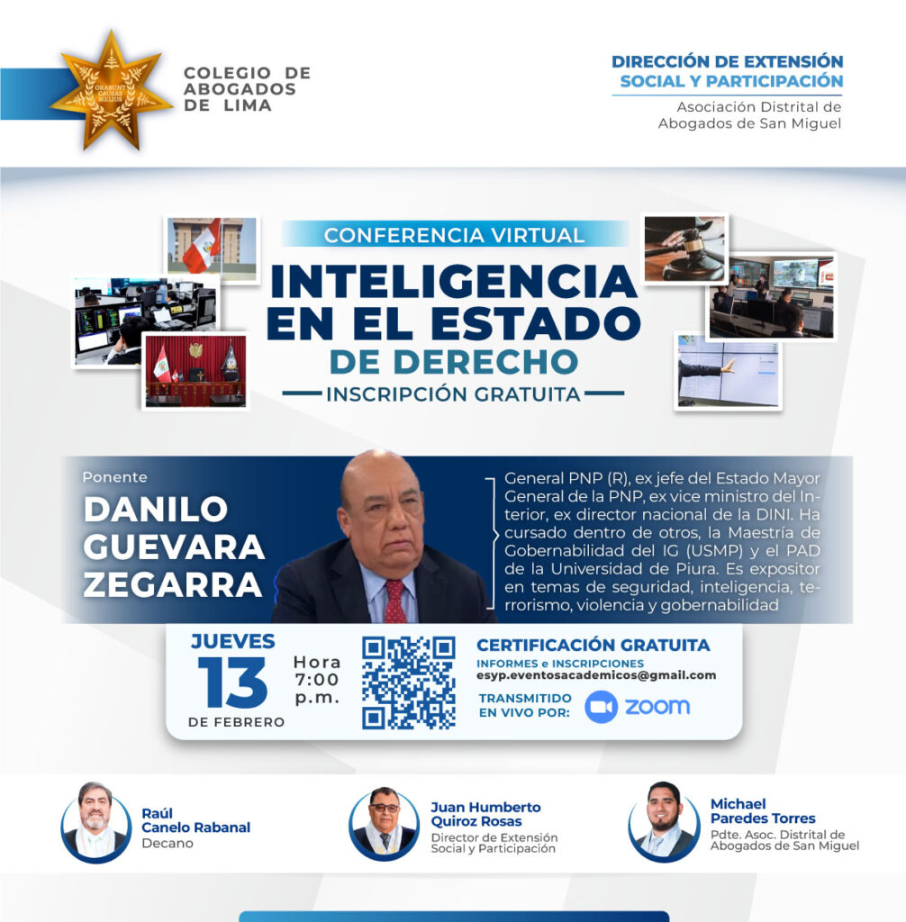 🔵 📢 #CONFERENCIA | INGRESO LIBRE | La Dirección de Extensión Social y Participación, a cargo del Dr. Juan Humberto Quiroz Rosas, en coordinación con la Asociación Distrital de Abogados de San Miguel, la cual preside el Dr. Michael Paredes Torres, invitan a los agremiados y público general a la CONFERENCIA VIRTUAL: "INTELIGENCIA EN EL ESTADO DE DERECHO"