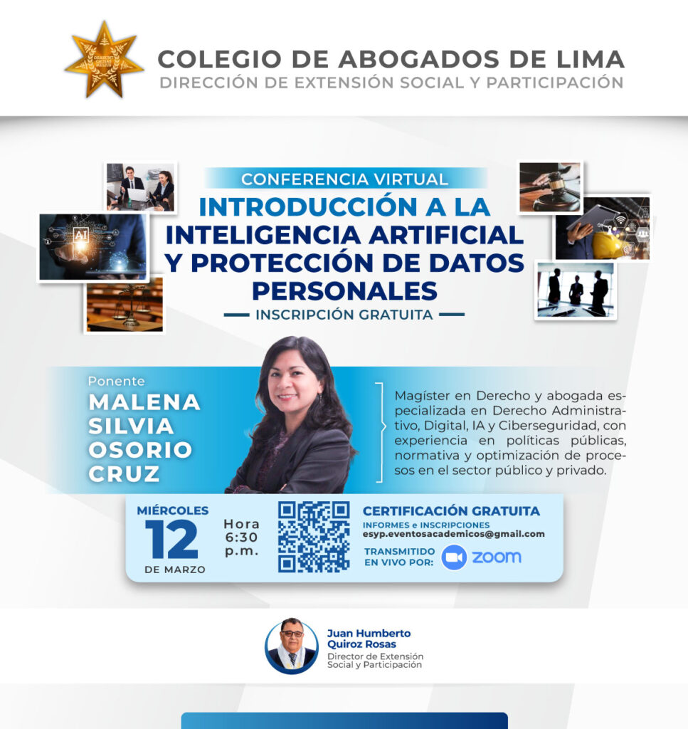 🔵📢#CONFERENCIA | La Dirección de Extensión Social y Participación, a cargo del Dr. Juan Humberto Quiroz Rosas, invitan a los agremiados y público general a la CONFERENCIA VIRTUAL: “INTRODUCCIÓN A LA INTELIGENCIA ARTIFICIAL Y PROTECCIÓN DE DATOS PERSONALES”.