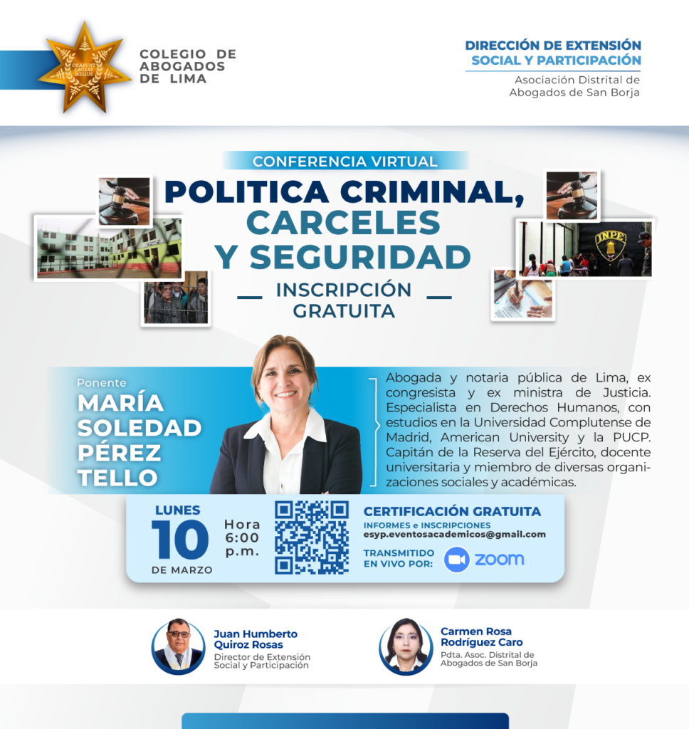 🔵📢#CONFERENCIA | La Dirección de Extensión Social y Participación, a cargo del Dr. Juan Humberto Quiroz Rosas, en coordinación con la Asociación Distrital de Abogados de San Borja, la cual preside la Dra. Carmen Rosa Rodríguez Caro, invitan a los agremiados y público general a la CONFERENCIA: "POLITICA CRIMINAL, CARCELES Y SEGURIDAD"