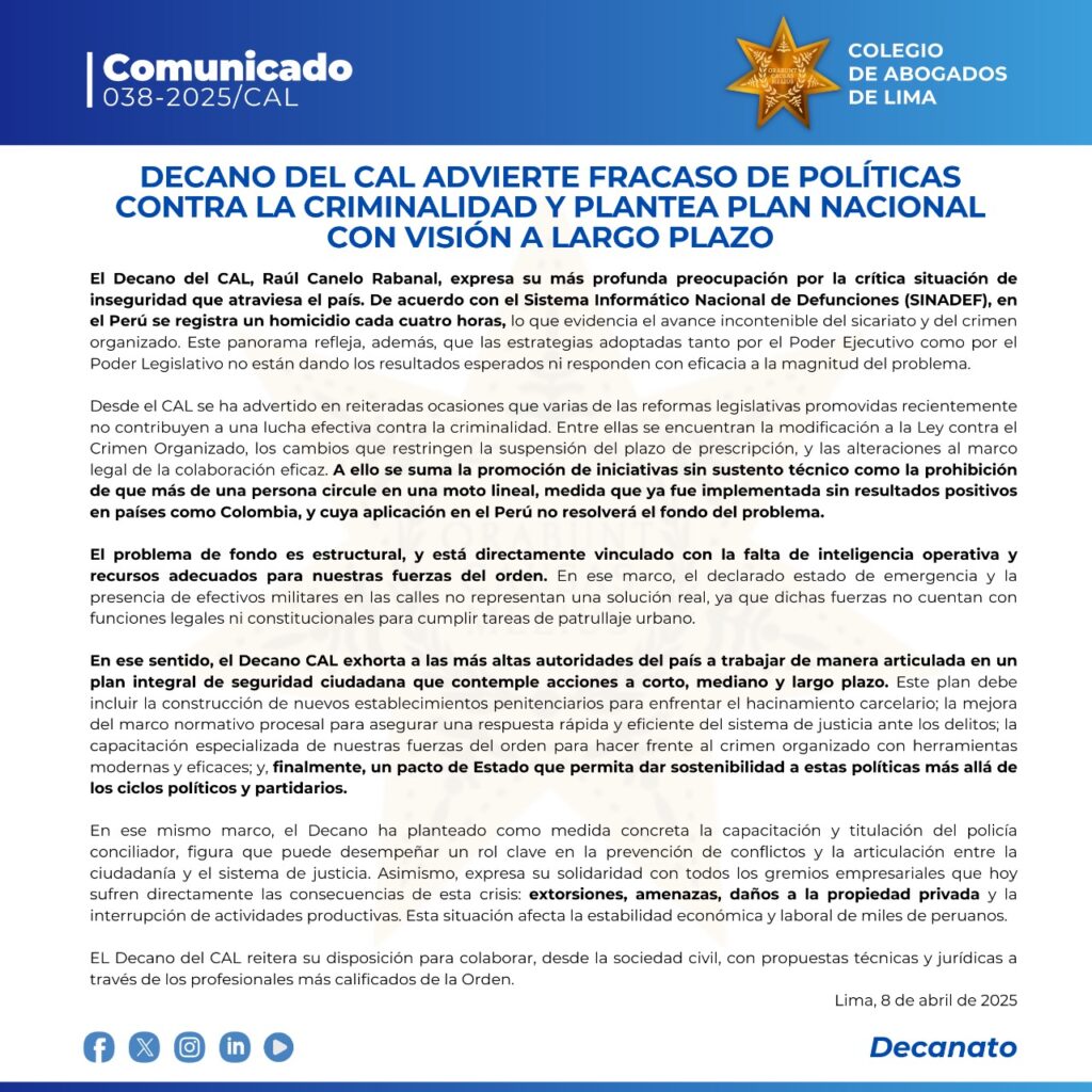 El Decano del CAL, Raúl Canelo Rabanal, expresa su más profunda preocupación por la crítica situación de inseguridad que atraviesa el país. De acuerdo con el Sistema Informático Nacional de Defunciones (SINADEF), en el Perú se registra un homicidio cada cuatro horas, lo que evidencia el avance incontenible del sicariato y del crimen organizado. Este panorama refleja, además, que las estrategias adoptadas tanto por el Poder Ejecutivo como por el Poder Legislativo no están dando los resultados esperados ni responden con eficacia a la magnitud del problema.