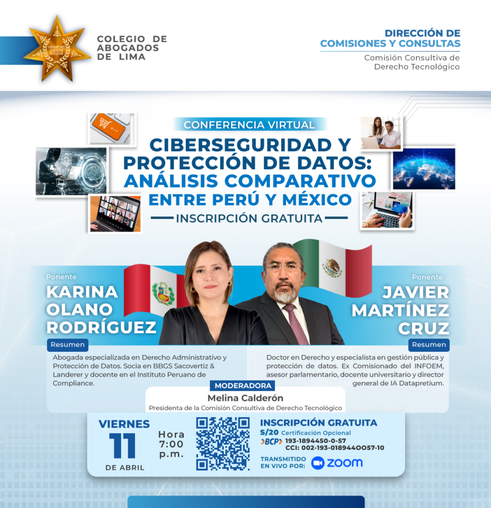 La Dirección de Comisiones y Consultas, dirigida por la Dra. Emilia Vicuña Cano, en coordinación con la Comisión Consultiva de Derecho Tecnológico, presidida por la Dra. Melina Calderón, invita a los agremiados y al público en general a la CONFERENCIA: "CIBERSEGURIDAD Y PROTECCIÓN DE DATOS: ANÁLISIS COMPARATIVO ENTRE PERÚ Y MÉXICO".