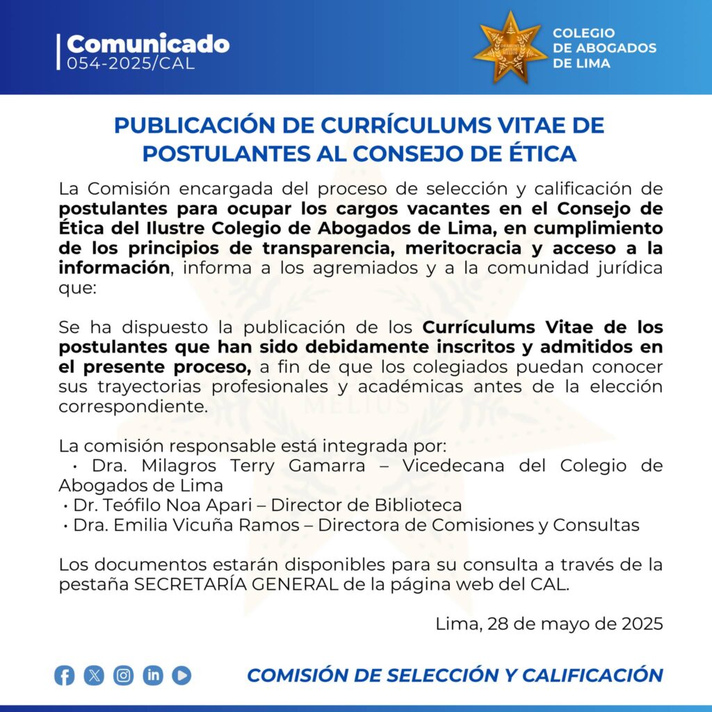 Los documentos estarán disponibles para su consulta a través de la pestaña SECRETARÍA GENERAL de la página web del CAL: https://www.cal.org.pe/v1/2025/05/28/publicacion-de-curriculums-vitae-de-postulantes-al-consejo-de-etica-del-cal/