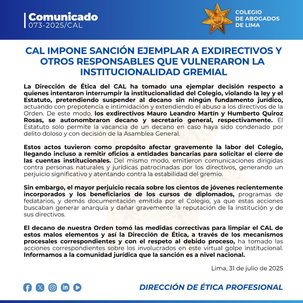 🔵📢 #COMUNICADO 073-2025 | CAL IMPONE SANCIÓN EJEMPLAR A EXDIRECTIVOS Y OTROS RESPONSABLES QUE VULNERARON LA INSTITUCIONALIDAD GREMIAL