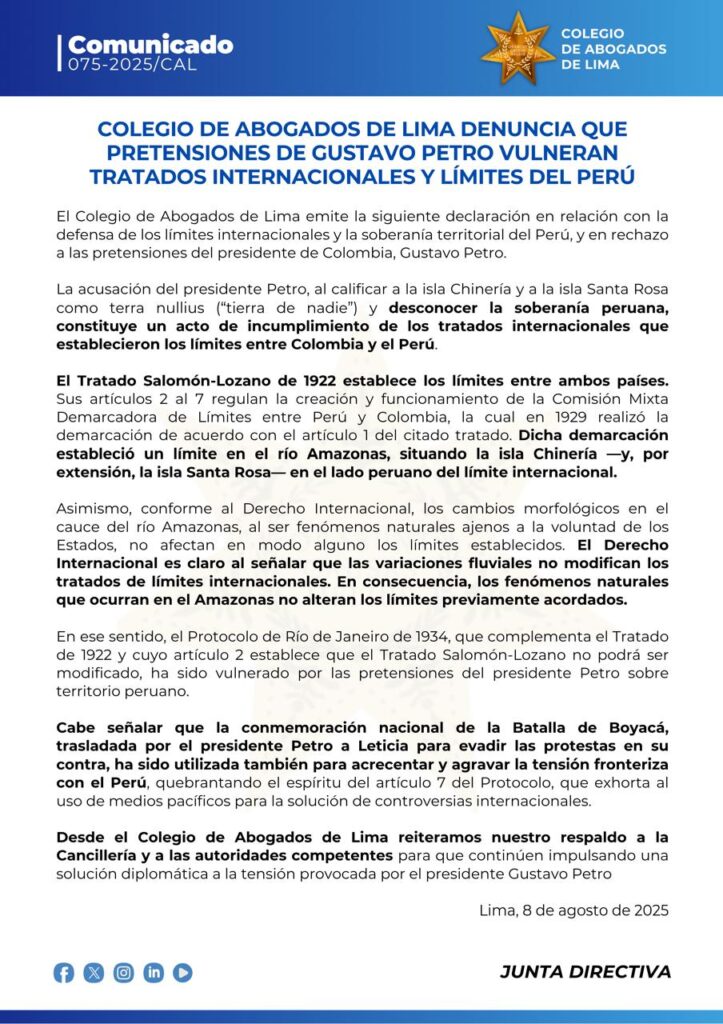 El Colegio de Abogados de Lima emite la siguiente declaración en relación con la defensa de los límites internacionales y la soberanía territorial del Perú, y en rechazo a las pretensiones del presidente de Colombia, Gustavo Petro.