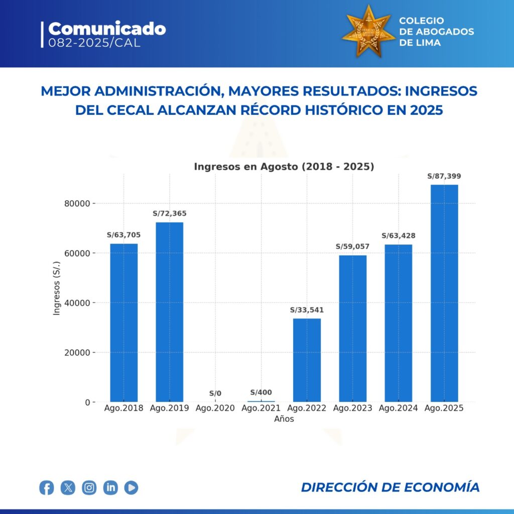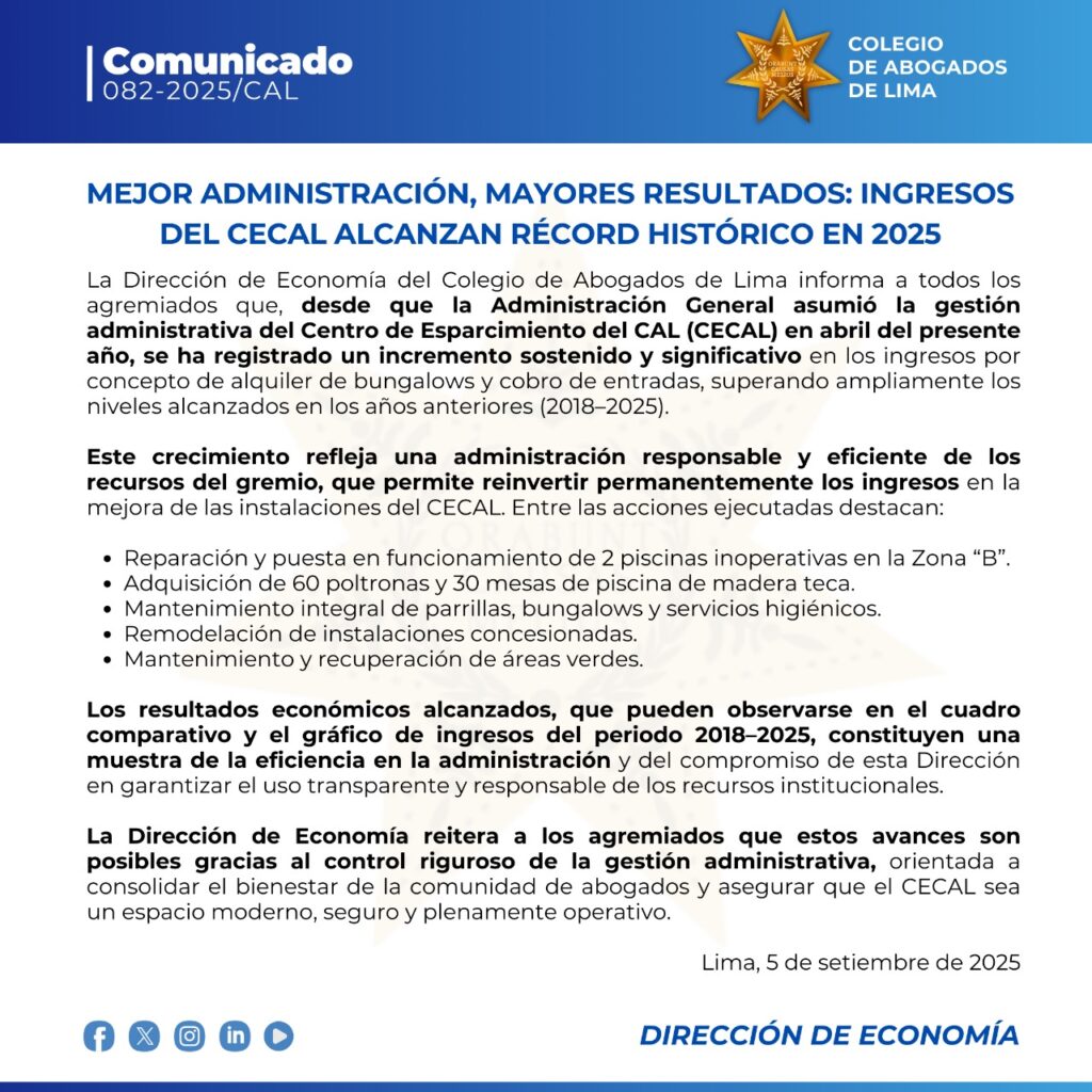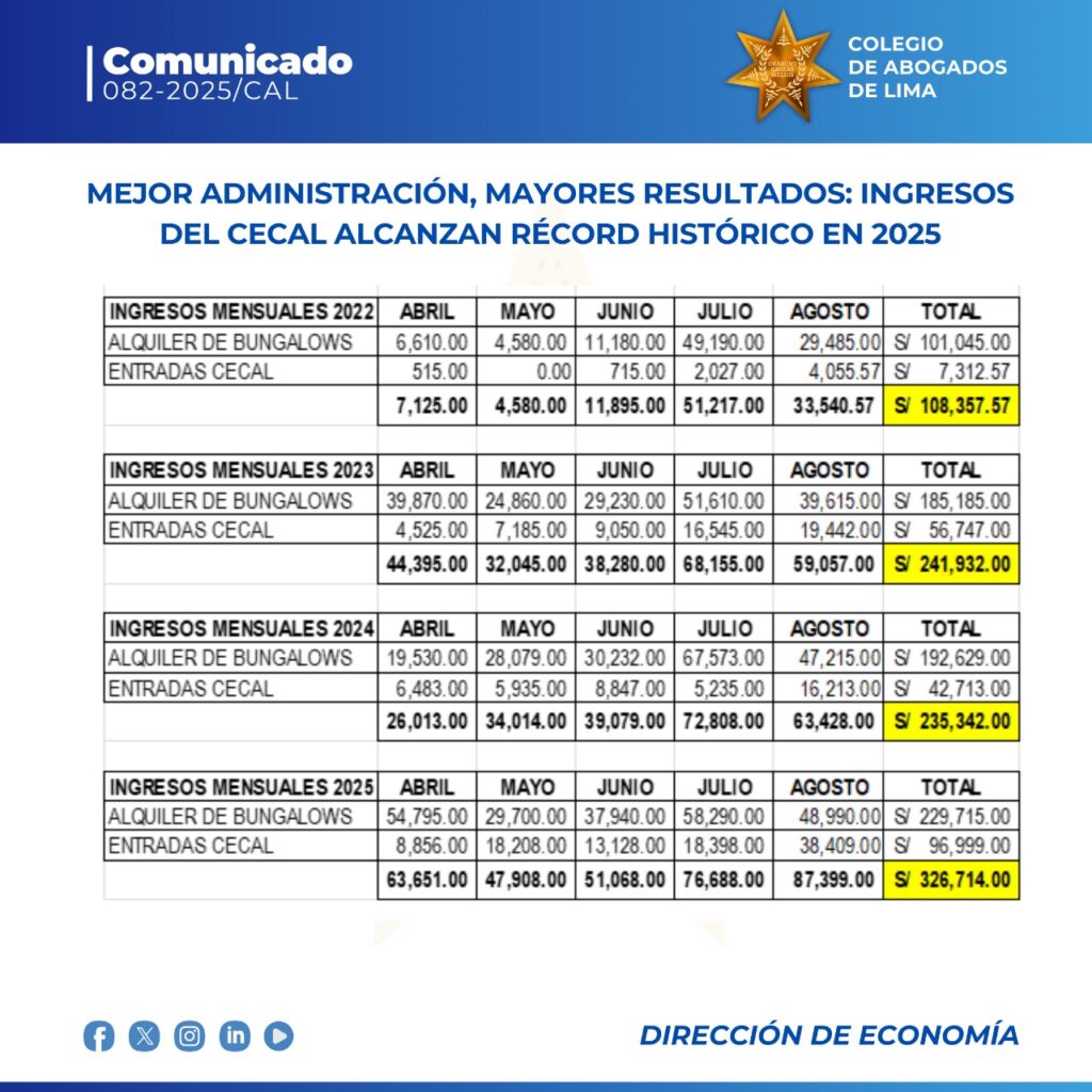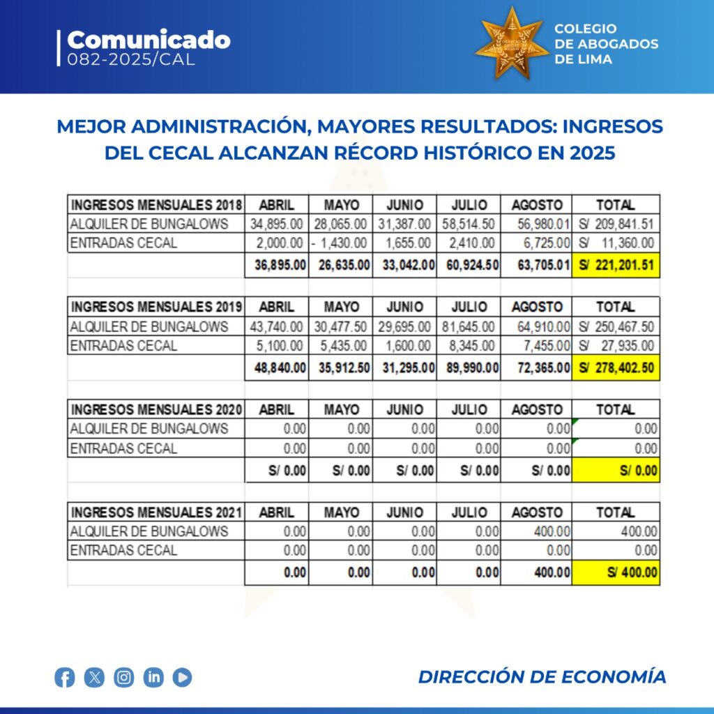 La Dirección de Economía del Colegio de Abogados de Lima informa a todos los agremiados que, desde que la Administración General asumió la gestión administrativa del Centro de Esparcimiento del CAL (CECAL) en abril del presente año, se ha registrado un incremento sostenido y significativo en los ingresos por concepto de alquiler de bungalows y cobro de entradas, superando ampliamente los niveles alcanzados en los años anteriores (2018-2025).