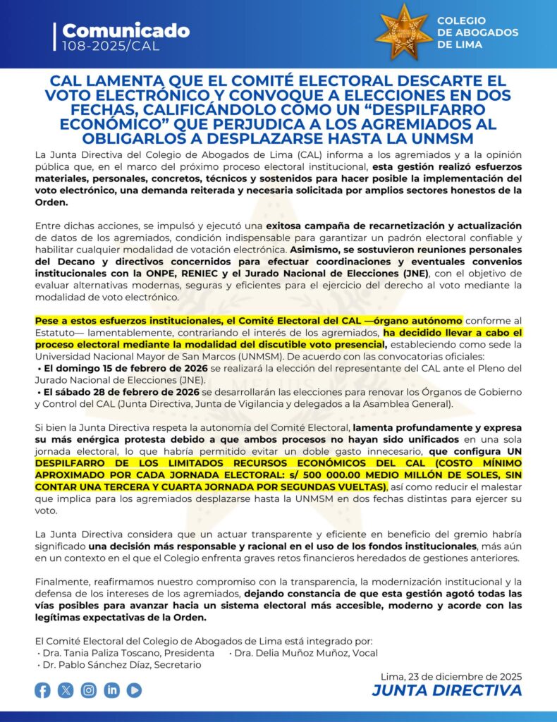 La Junta Directiva del Colegio de Abogados de Lima (CAL) informa a los agremiados y a la opinión pública que, en el marco del próximo proceso electoral institucional, esta gestión realizó esfuerzos materiales, personales, concretos, técnicos y sostenidos para hacer posible la implementación del voto electrónico, una demanda reiterada y necesaria solicitada por amplios sectores honestos de la Orden.