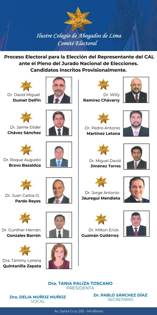 El Ilustre Colegio de Abogados de Lima (CAL), a través del Comité Electoral, informa a los agremiados que, en el marco del Proceso Electoral para la Elección del Representante del CAL ante el Pleno del Jurado Nacional de Elecciones (JNE), se ha cumplido con la etapa de inscripción provisional de candidatos, conforme al cronograma y a la normativa electoral vigente.