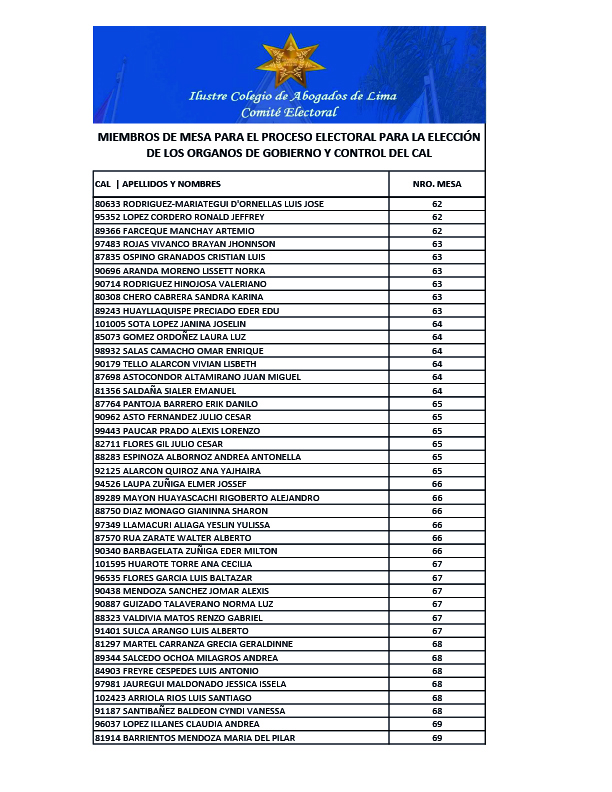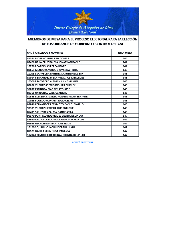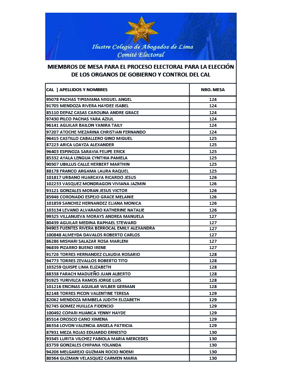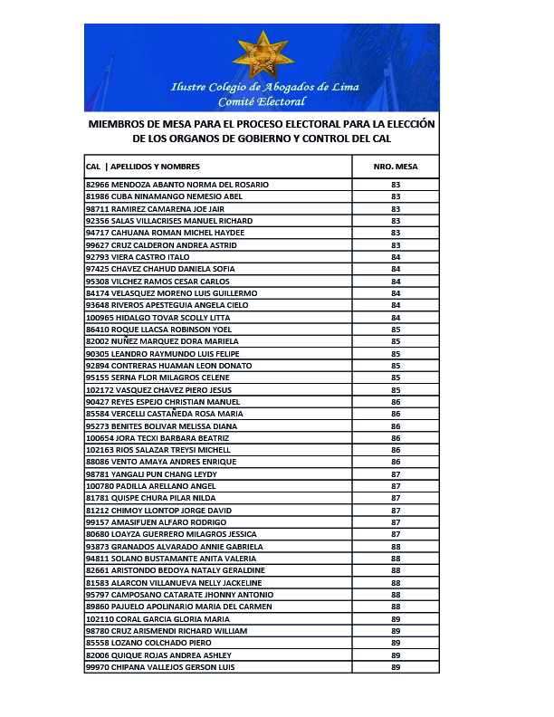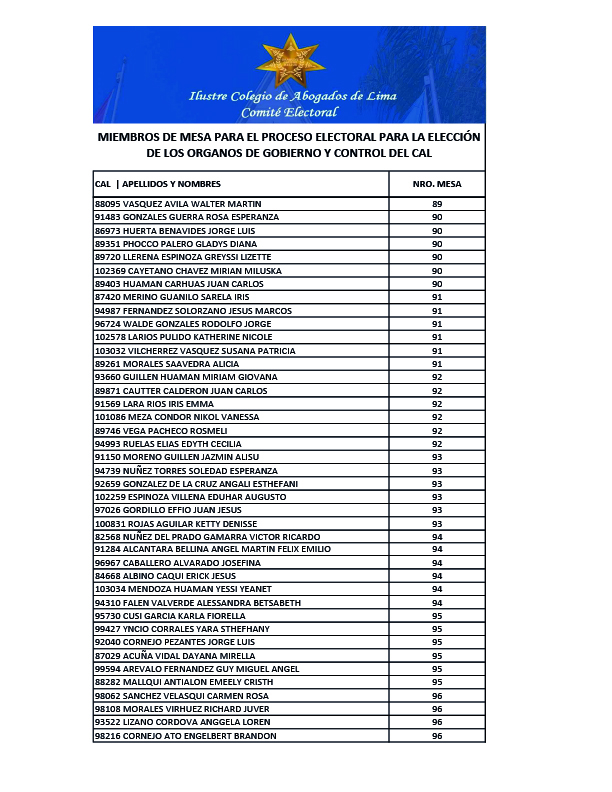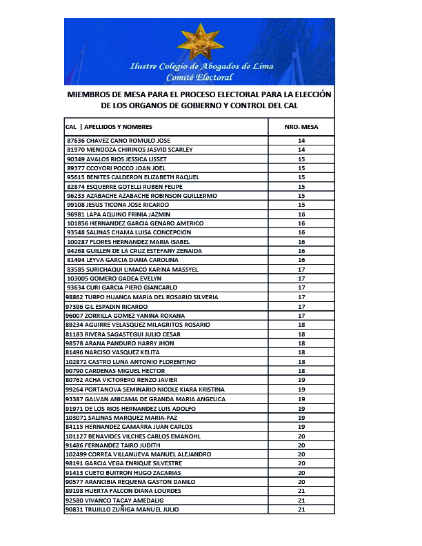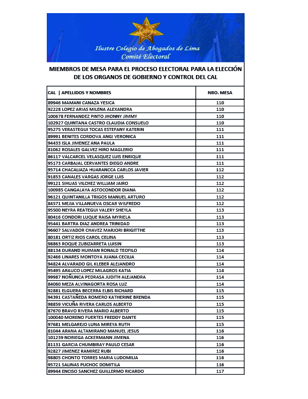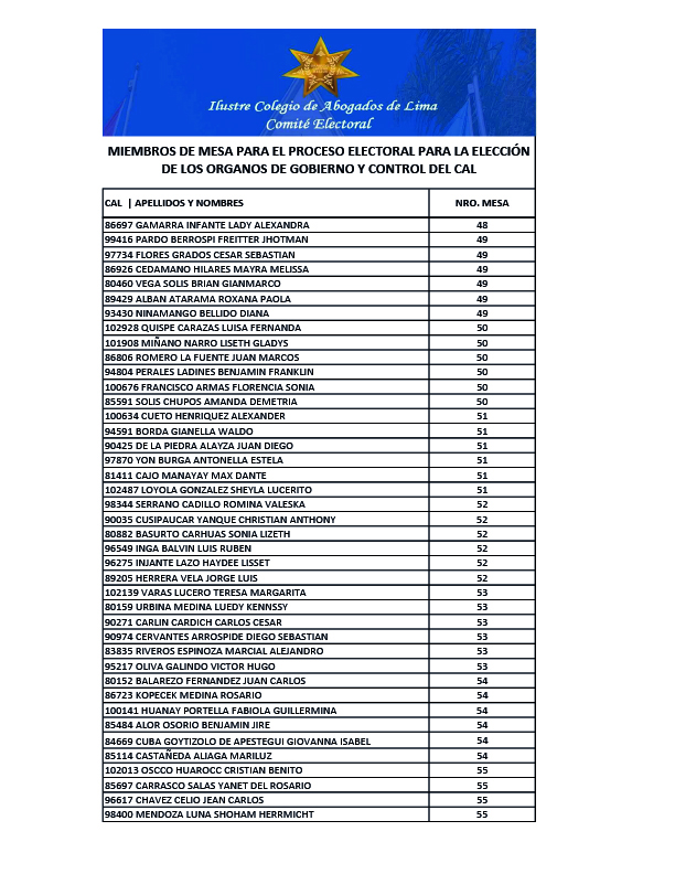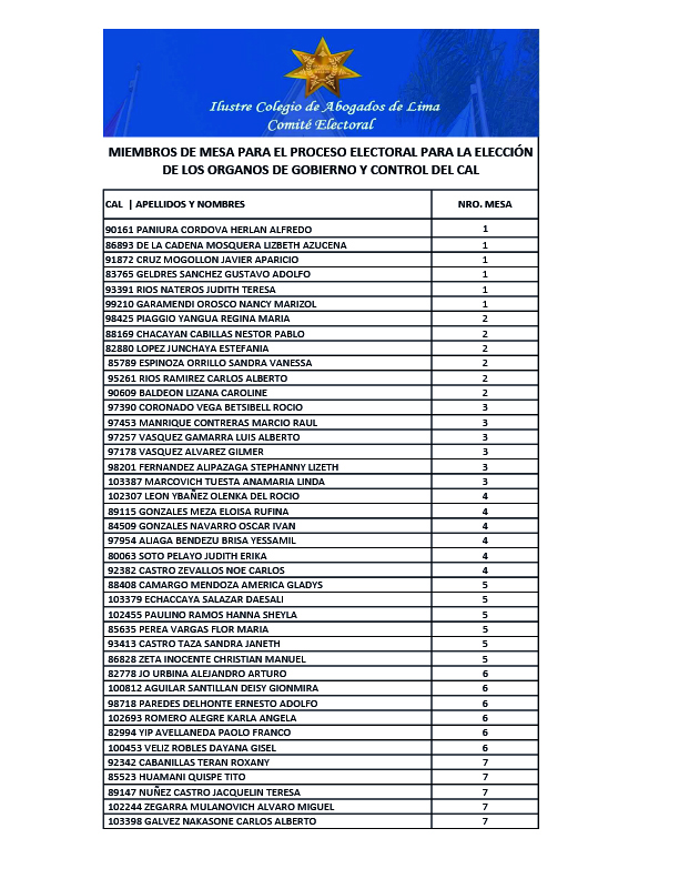 MIEMBROS DE MESA PARA EL PROCESO ELECTORAL PARA LA ELECCION DE LOS ORGANOS DE GOBIERNO Y CONTROL DEL CAL