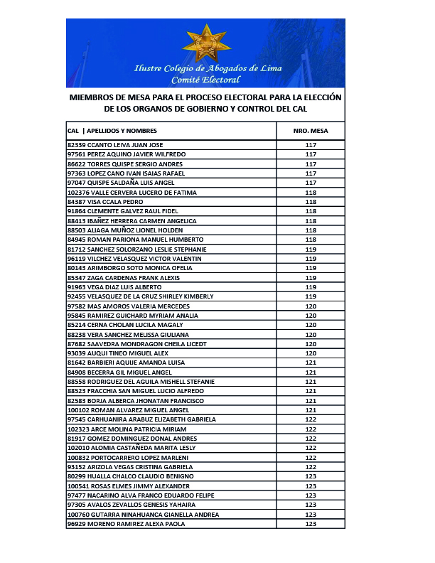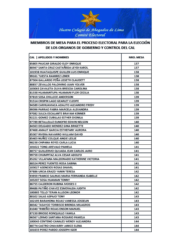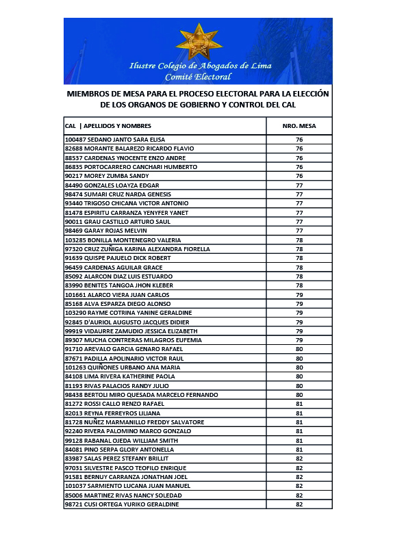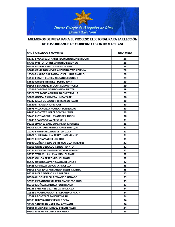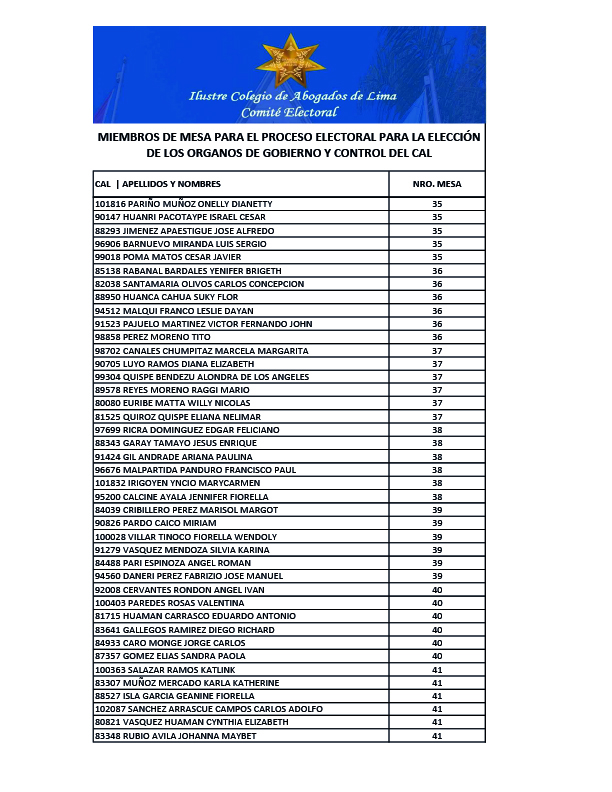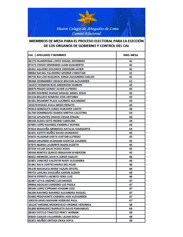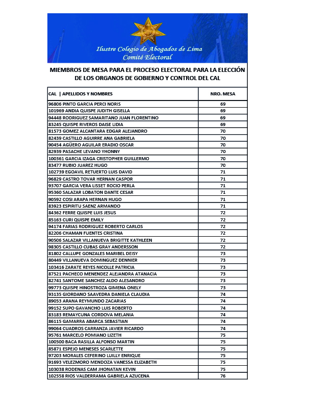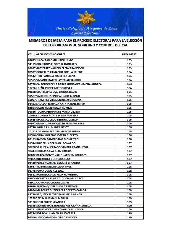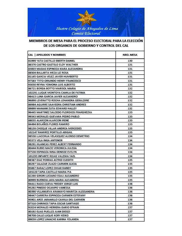 MIEMBROS DE MESA PARA EL PROCESO ELECTORAL PARA LA ELECCION DE LOS ORGANOS DE GOBIERNO Y CONTROL DEL CAL