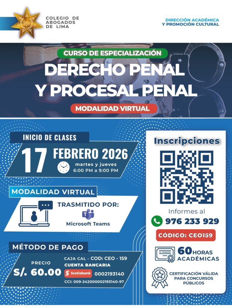 La Dirección Académica y Promoción Cultural del Colegio de Abogados de Lima invita a los miembros de la orden y profesionales del Derecho a participar en nuestro próximo Curso de Especialización en Derecho Penal y Procesal Penal.
