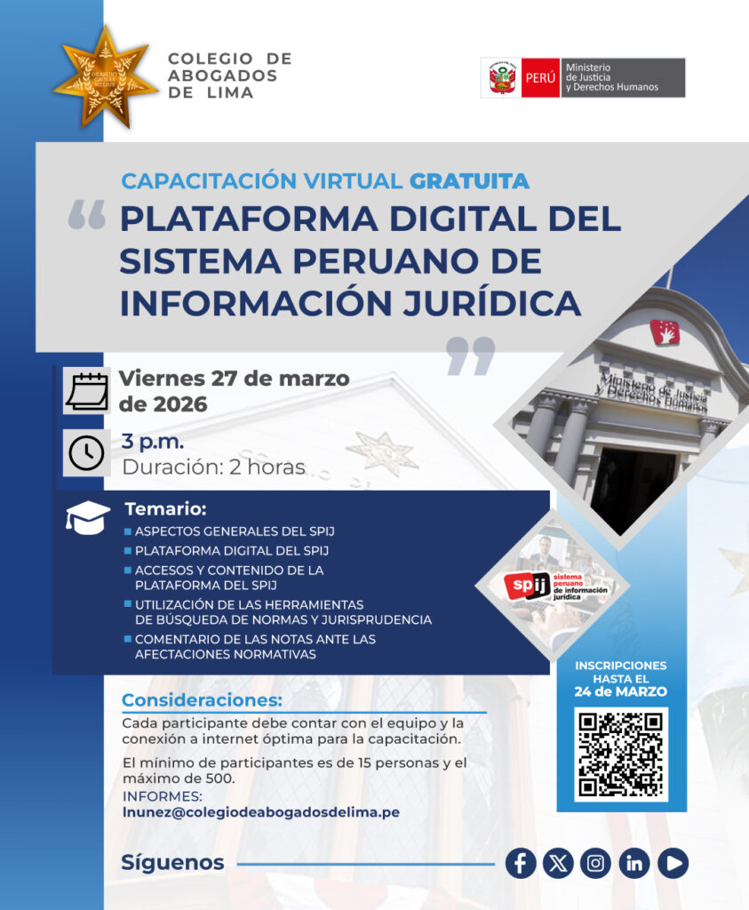 El Colegio de Abogados de Lima, junto al Ministerio de Justicia y Derechos Humanos, te invita a una capacitación virtual esencial para tu práctica profesional: el manejo de la Plataforma Digital del Sistema Peruano de Información Jurídica (SPIJ).