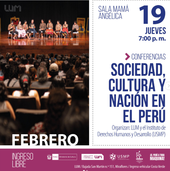El Lugar de la Memoria, la Tolerancia y la Inclusión Social (LUM), órgano del Ministerio de Cultura, en coordinación con el Instituto de Derechos Humanos y Desarrollo de la Universidad de San Martín de Porres (USMP), organiza el ciclo de conferencias “Diálogos sobre sociedad, cultura y política en el Perú”, con el propósito de promover el análisis crítico y el diálogo plural en torno a los procesos sociales, culturales y políticos que han marcado la construcción histórica del país.