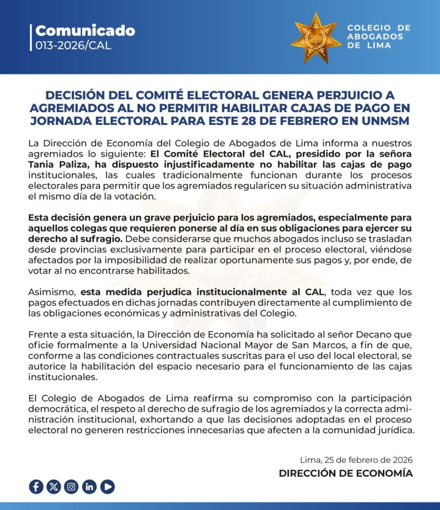 La Dirección de Economía del Colegio de Abogados de Lima informa a nuestros agremiados lo siguiente: El Comité Electoral del CAL, presidido por la señora Tania Paliza, ha dispuesto injustificadamente no habilitar las cajas de pago institucionales, las cuales tradicionalmente funcionan durante los procesos electorales para permitir que los agremiados regularicen su situación administrativa el mismo día de la votación.