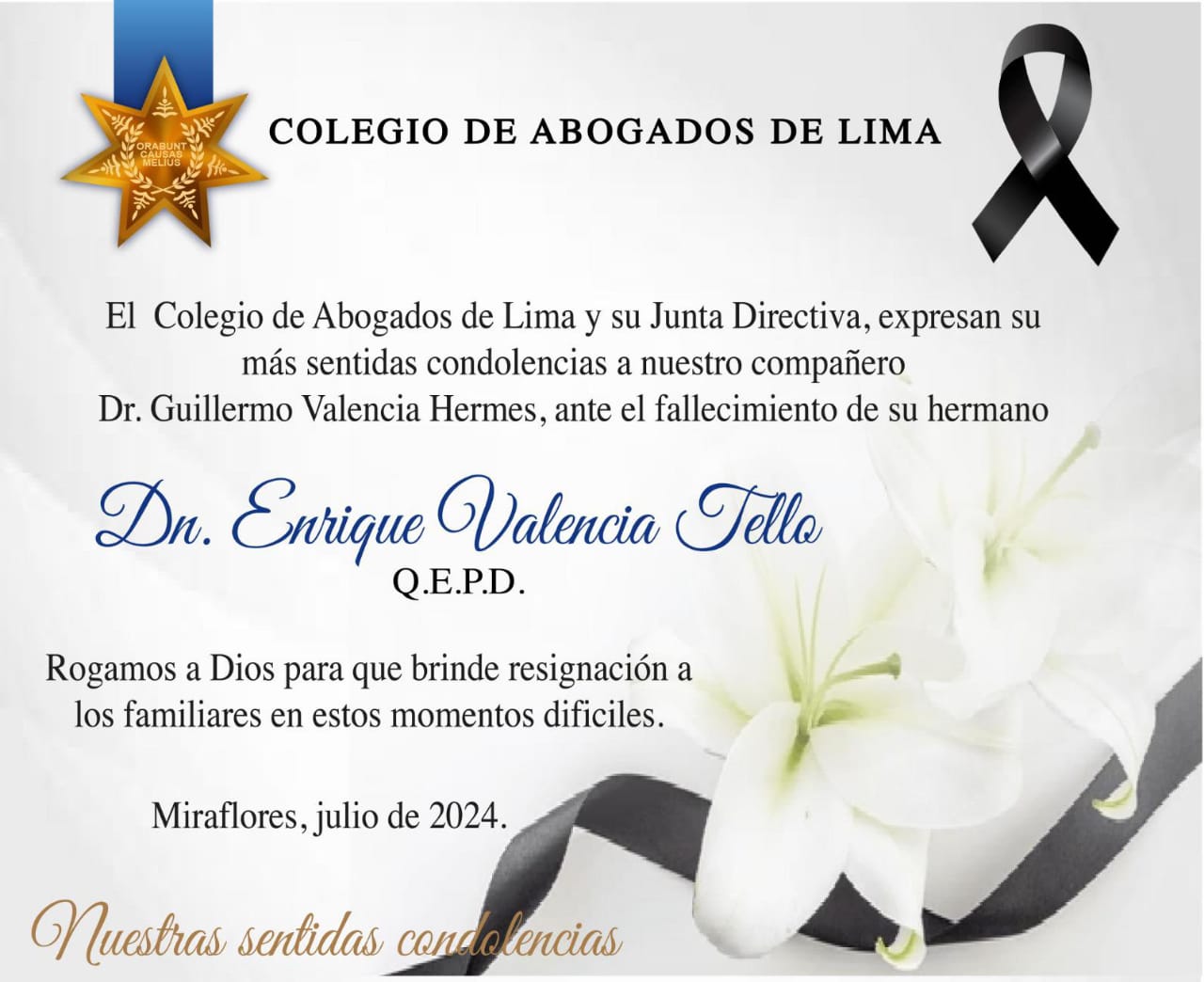Condolencias🕊 El Colegio de Abogados de Lima y su junta directiva, expresan su más sentidas...
